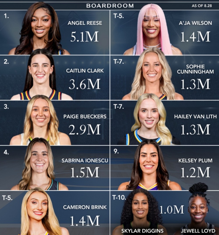 9月15日讯 WNBA本赛季常规赛已经结束,美媒boardroom统计了WNBA球星的社媒粉丝数排行。