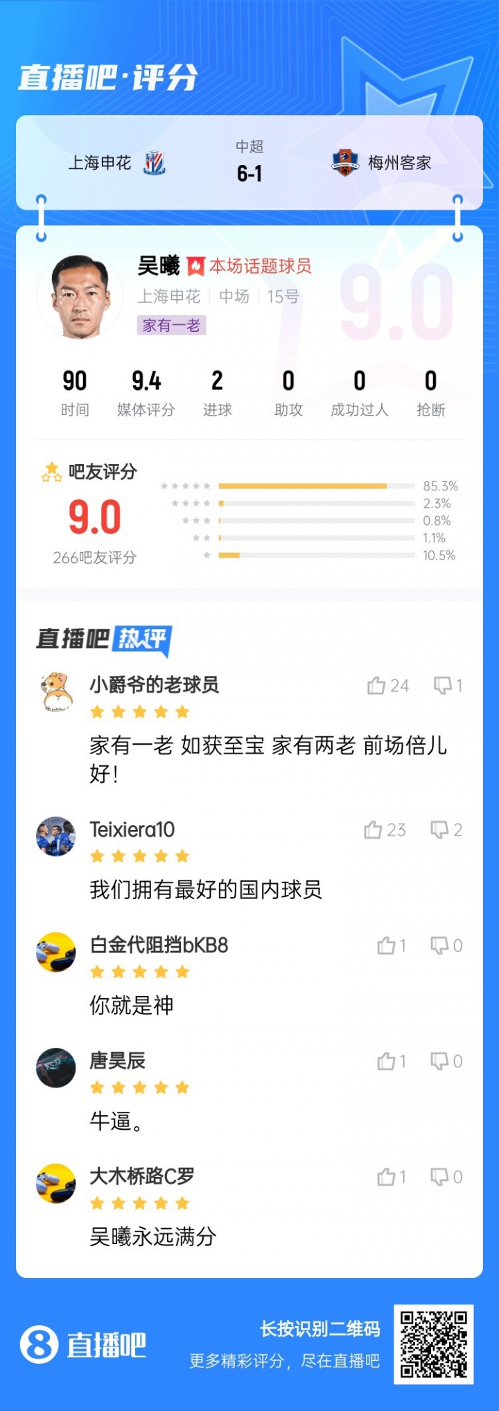 【】中超第26轮最佳球员评选结果出炉,上海申花队长吴曦当选!36岁的吴曦梅开二度,率领申花主场6-1击败梅州客家,保持对中超冠军的冲击,这是吴曦本赛季第二次赢得中超最佳评选!