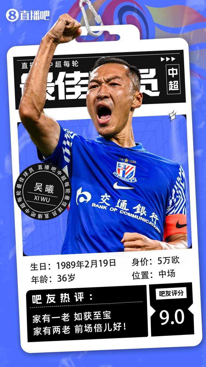 【】中超第26轮最佳球员评选结果出炉,上海申花队长吴曦当选!36岁的吴曦梅开二度,率领申花主场6-1击败梅州客家,保持对中超冠军的冲击,这是吴曦本赛季第二次赢得中超最佳评选!